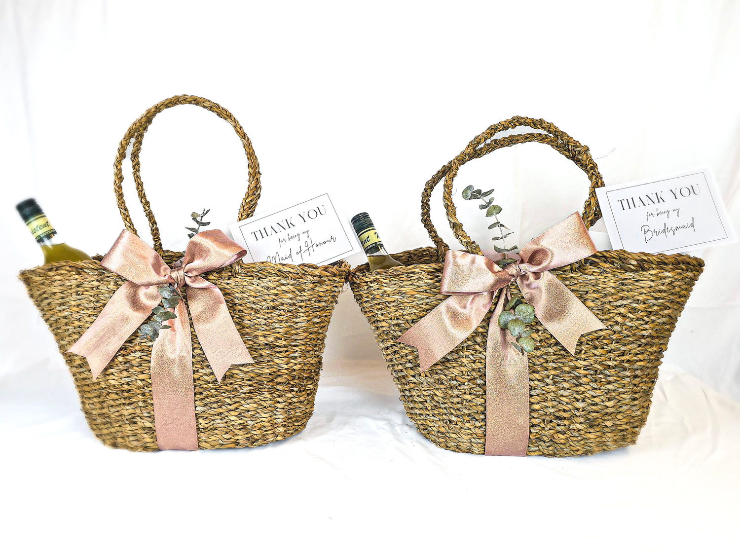 Our luxury magnetic gift boxes, adorned with double satin ribbon and botanicals, make a lasting impression. Each box comes with a personalised gift tag featuring your bridesmaid or groomsman's name. Alternatively, our stylish and practical seagrass tote serves as a chic beach bag your girls will love to reuse. Both options are crafted to create a memorable "wow" factor, ensuring your bridal party feels special from the moment they receive their gift.