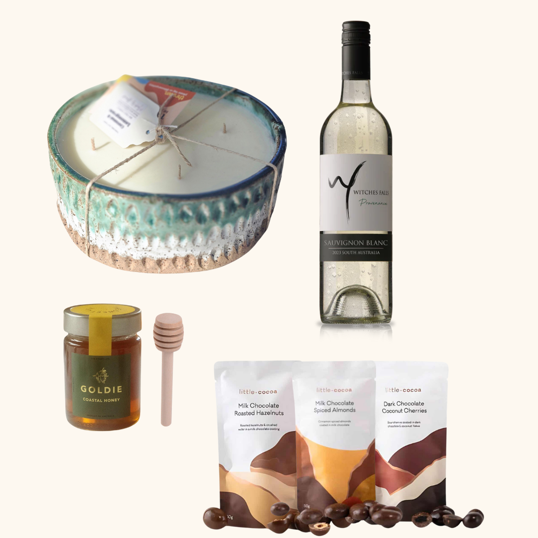 Paired with a bottle of Witches Falls wine from the heart of the Gold Coast, award-winning Goldie Honey, and a pack of 3 artisan Little Cocoa chocolates, this impeccably presented gift box is a celebration of thoughtful luxury and local craftsmanship. A true taste of the Gold Coast, this is a gift hamper your recipient will adore and remember.